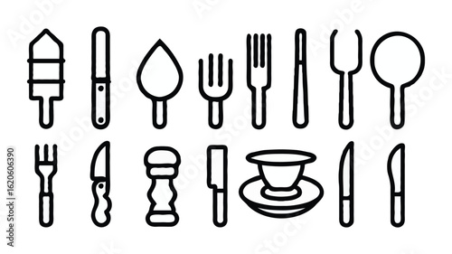 kitchen utensile, tableware, food preparation, dining, minimalist, knife, fork, spoon, spatula, salt shaker, cup, saucer, kitchen utensile, cookware, cutlery, flatware, utensil, kitchen, eatery, bistro, cafes, iconography, graphic design, clip art