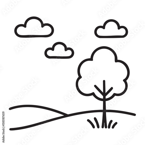 landscape, minimalist, illustration, outline, black-and-white, tree, cloud, hill, nature, scene, drawing, simple, icon, vector, design, graphic, element, isolated, sky, field, meadow, grass, rural, countryside, environment, art, symbol, signs, pictogram, cartoon, flat, style, clean, modern, background, clip art, shape, line art, monochrome, scenery, outdoors, day, weather, plant, hillside, iconic