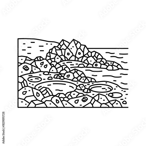 nature, landscape, rock, stone, water, river, stream, sea, ocean, coastline, shore, beach, mountain, geology, geologic, terrain, earth, natural, graphic, illustration, vector, line art, outline, black-and-white, minimalist, abstract, stylised, geometric, simple, drawing, doodle, vignetting, icon, symbol, pattern, texture, boulder, pebble, wave, modern, design