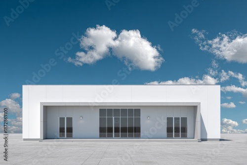 Minimalist modern building with glass doors under a blue sky.