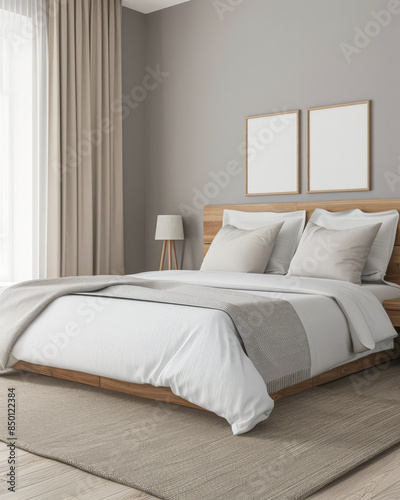 Minimalist modern hotel room in beige tone with natural window lighting. Interiors composition.