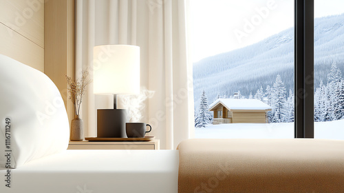 Minimalist Mountain Cabin Bedroom with Winter View and Cozy Decor