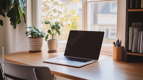 Minimalist Office Space with Wooden Desk and Soft Natural Light