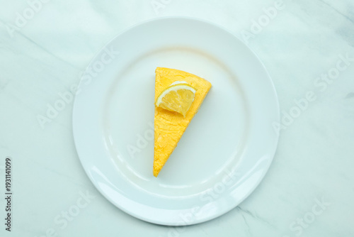 cheesecake, dessert, lemon, slice, cake, food, plate, white, background, marble, yellow, sweet, tasty, delicious, epicure, bakery, confection, treat, pastry, cookery, ingredient, citrous, fruit, fresh, diet, healthy, minimalism, simple, overhead, single, portion, eatery, menu, dish, culinary, breakfast, lunch, snack, refreshment, nobody, studio, shot, bright, elegant, clean, top