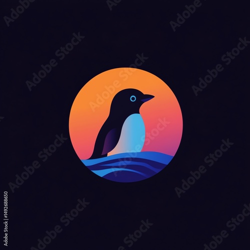 penguin, sunset, ocean, wave, minimalist, logotype, simple, happy, silhouette, bird, water, design, art, graphic, illustration, vector, icon, wildlife, animal, nature, abstract, gradient, colours, blue, orange, dark, background, serene, peaceful, calm, tranquil, cute, adorable, charming, elegant, modern, stylish, clean, flat, style, high-coloured, vibrant, bright, tropical, antarctica, cold, ice, winter, summer