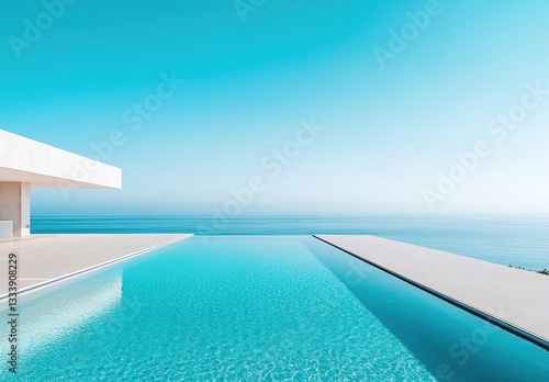 Minimalist pool with an ocean view, clear blue sky, modern architecture.