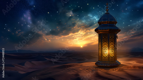 minimalist ramadan greeting card template with arabic lamp on desert