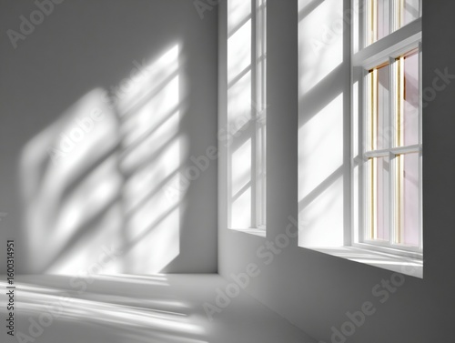 Minimalist scene with white background highlighted by dramatic light and deep grey shadows