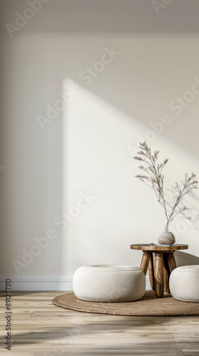 Minimalist serene corner in an apartment room with minimal decor and copy space. Relaxing and meditation spaces conceptual image.