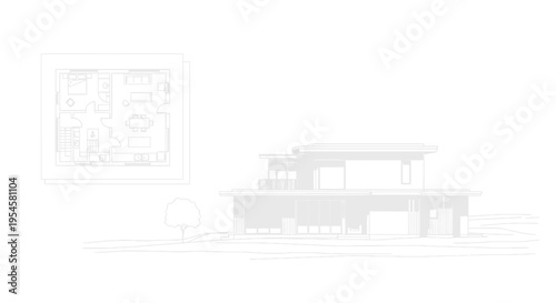 Minimalist vector illustration of a contemporary residential house with a detailed floor plan, representing modern architecture and home design concepts