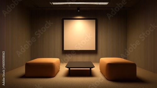 minimalist, waiting, area, warm, tone, interior, design, room, empty, modern, contemporary, empty space, beige, brown, orange, brownish, wood, paneling, wall, picture, frame, table, hot drink, low, cushion, seating, lighting, ambient, soft, illumination, light, calm, quiet, space, neutral, three-dimensional, rendering, studio, realistic, furnished, simple, clean, minimal