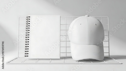 white, cap, baseball, hat, notebook, spiral, blank, minimalist, clean, studio, lighting, shadow, grid, surface, object, accessory, headwear, stationery, writing, design, concept, modern, simple, empty, copy, space, background, isolated, product, display, composition, still, life, fashion, apparel, casual attire, summer, sport
