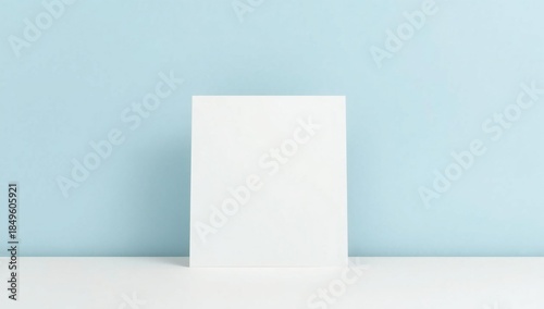 Minimalist white card or poster standing against a soft blue wall