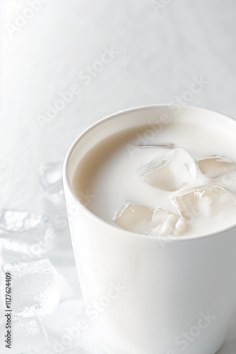 Minimalist White Ceramic Coffee Cup with Creamy Drink and Ice Cubes