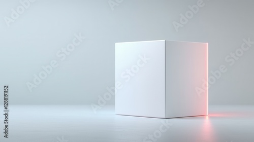 Minimalist white cube in modern setting with soft lighting and subtle red glow on the edge.