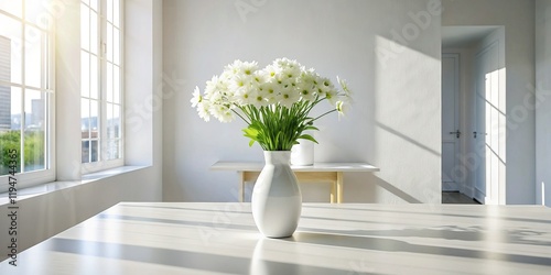 Minimalist White Interior Design with Simple Flower Arrangement - Stock Photo