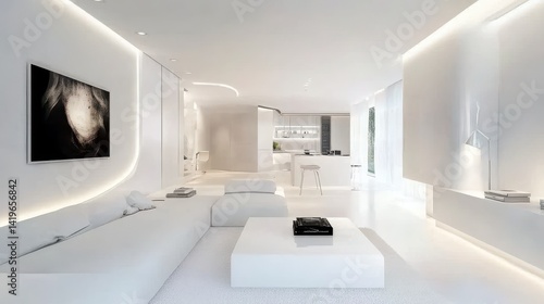 minimalist, white, interior, design, living, room, modern, architecture, furniture, home, decor, clean, bright, lighting, contemporary, monochrome, artwork, sofa, table, open, space, kitchen, chair, stool, book, pillow, sleek, elegant, style, luxury, apartment, residence, gallery, picture, wall, floor, ceiling, window, curtain, airy, roomy, pristine, serene, refined, geometric, light