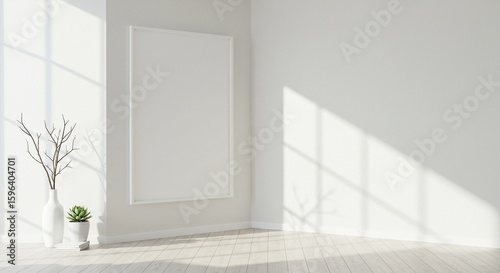 Minimalist White Room Corner with Blank Vertical Frame and Natural Sunlight