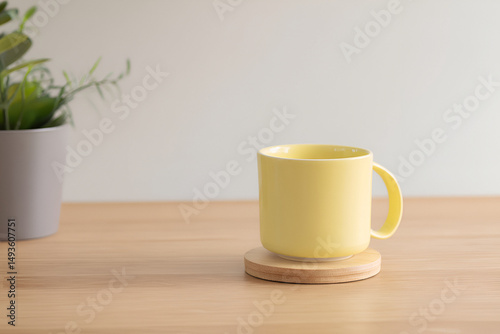 Minimalist wooden desk with a pastel yellow coffee mug and a plant