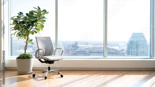 Minimalist workspace with ergonomic chair and greenery, bathed in soft daylight. A serene blend of comfort and modern simplicity.