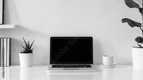 laptop, computer, workspace, desk, office, minimal, modern, clean, white, simple, elegant, design, style, productivity, work, business, professional, technology, plant, hot drink, cup, home office, freelancer, entrepreneur