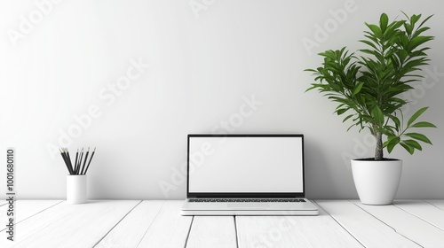 Minimalist Workspace with Laptop, Potted Plant, and Pencils on White Desk