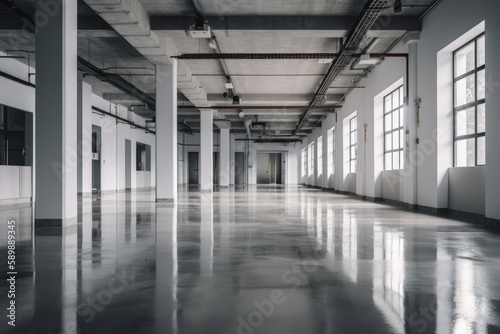 industrial, concrete, steel, glasses, minimal, open, contemporary, simple, roomy, clean, sleek, bright, uncluttered, functional, futuristic, urban, edgy, monochromatic, stripped, geometric, raw, high technology, sharp, streamlined, polished, minimalist, neat, empty, aesthetic, corridor, interior, building, floor, architecture, hall, office, hallway, business, garage, underground, room, construction, perspective