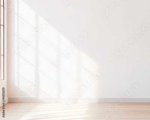 Minimalistic Bright Office Wall with Window Shadows Cast on Smooth White Surface and Wooden Floor