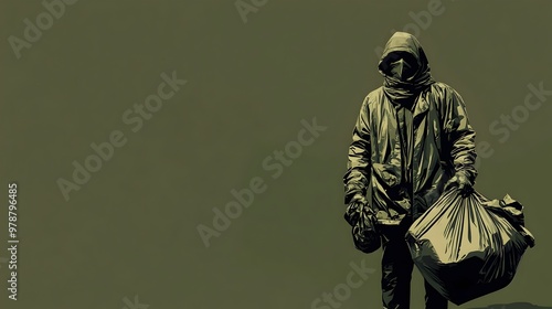 Minimalistic Pop Art Smuggler Disguised as a Garbage Collector on a Plain Olive Background