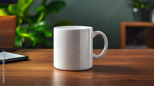 Minimalistic White Mug on a Wooden Office Desk. Generative AI