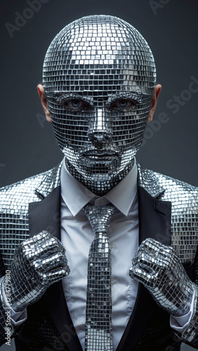 Mirror Man: Dazzling in a reflective mosaic suit, a figure emerges with an air of futuristic sophistication and captivating mystery.