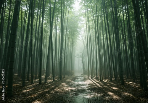 Misty bamboo forest with soft sunlight filtering through the tall stalks