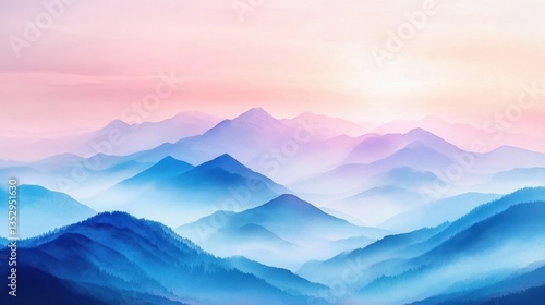 mountain, landscape, sunrise, sunset, blue, pink, purple, fog, mist, dawn, dusk, sky, horizon, peak, range, scenic, nature, peaceful, serene, calm, tranquil, beautiful, vibrant, colours, pastel, soft, dreamy, magical, atmosphere, mountain, aerial, view, high, angle, panorama, wide, shot, travel, adventure, exploration, vista, viewpoint, scenery, image, photo, art, digital