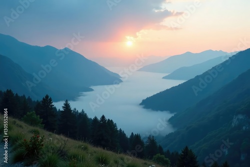 Misty dawn veil shrouds mountain slopes beneath radiant blue sky, landscape, light, mystery