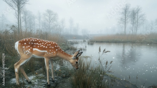 cervid, wildlife, nature, forest, duck pond, mist, winter, animal, fog, landscape, photo, beauty, scenic, autumn, animal, spotted, cute, peaceful, calm, outdoors, snowy, foggy, cold, water, grass, tree, brown, white, conservation, environment, preserve, mammal