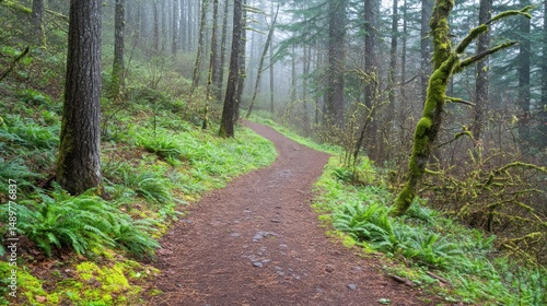 Misty forest trail winding uphill, ferns lining path, background trees. Nature, hiking, travel