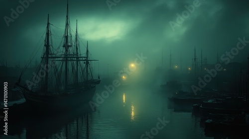 misty, harbor, ship, dark, foggy, green, water, light, sailing, old, ancient, port, vessel, night, calm, fog, cloudy, dramatic, silhouette, wooden, still, ocean, boat, gloomy, skittish, ghostly, evening, atmosphere, quiet, haunted, mystery, shadow, cold, silence, illuminated, light