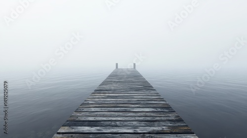 Misty lakeside dock extending into foggy horizon