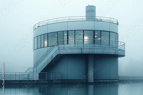 water, tower, circular, structure, building, architecture, modern, fog, mist, sky, stillness, calm, serene, peaceful, tranquil, quiet, minimalist, industrial, geometric, shape, design, steel, concrete, grey, blue, white, metal, window, door, stair, platform, balcony, horizon, landscape, exterior, cold, damp, morning, day, water tower