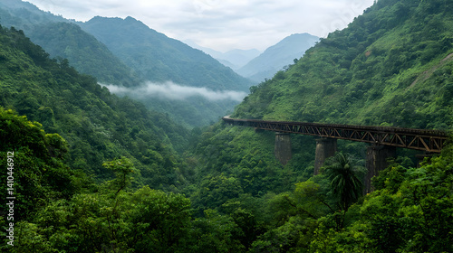 mountain, vale, forest, bridge, green, nature, landscape, tree, jungle, overlook, view, hill, cloud, mist, fog, timberland, hiking, travel, scenic, viewpoint, cloudy, overcast, rural, remote, vista, trekking