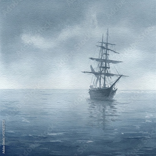 ship, sea, ocean, mist, fog, haze, silhouette, ghost, vessel, sailing, gouache, painting, water, mystery, soft, light, dark, grey, shadow, sky, horizon, quiet, lonely, haunted, ghostly, scene, landscape, art, brush, stillness, calm, cold, isolation, eerie, silent, weather, faded, moody, blur, maritime, lost, sailboat, voyage, chill, past, storm, timeless, aethereal