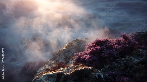 Misty sunlight illuminates vibrant purple seaweed on coastal rocks at dusk