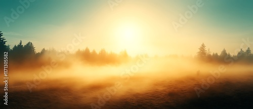 sunrise, mist, fog, forest, tree, wood, nature, landscape, scenery, dawn, morning, sun, light, gold, yellow, orange, sky, peaceful, tranquil, serene, calm, mystical, magical, atmospheric, dreamy, aethereal, hazy, soft, warm, beautiful, field, ground, horizon, vibrant, colours, picturesque, scenic, view