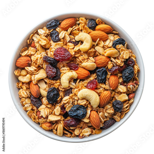 granola, oat, almond, cashew, grape, cranberry, dried fruit, nut, breakfast, healthy, food, snack, closeup, overhead, white bowl, alimentary, natural, organic, texture, mix, ingredient, hearty, wholesome, cereal, seed, flocked, rustic, appetising, delicious, homestyle, topview