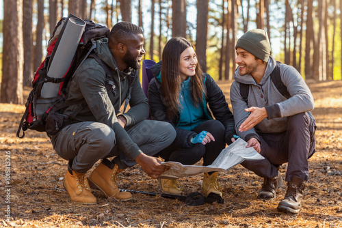 Mixed race friends with backpacks sitting around map, hiking in autumn forest, got lost