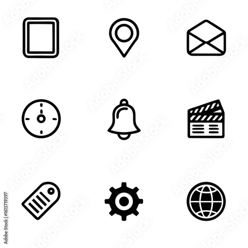 icon, vector, set, location, envelope, mail, notification, bell, clapper-board, tags, label, gear, cogwheel, setting, globe, earth, communication, interface, design, graphic, digital