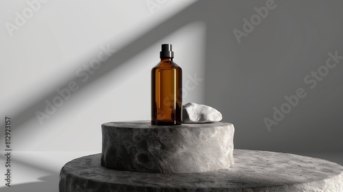 Mock up brown glass bottle on a stone podium on a gray background Bath spa treatment concept : Generative AI