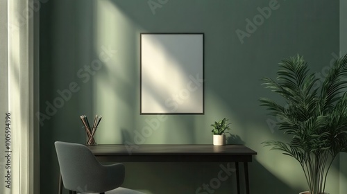 Mock up frame of a modern home office with a dark grey desk against a muted green wall