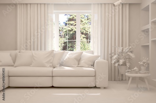 Mock up of stylish room in white color with sofa and green landscape in window. Scandinavian interior design. 3D illustration