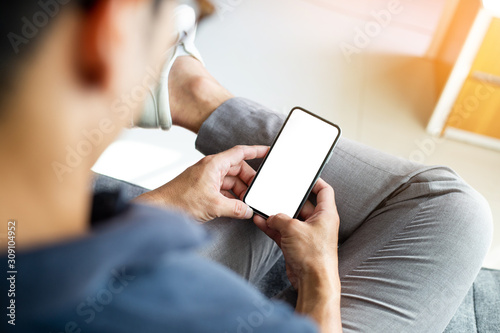 Mockup image blank white screen cell phone.men hand holding texting using mobile on desk at home office.background empty space for advertise text.people contact marketing business,technology